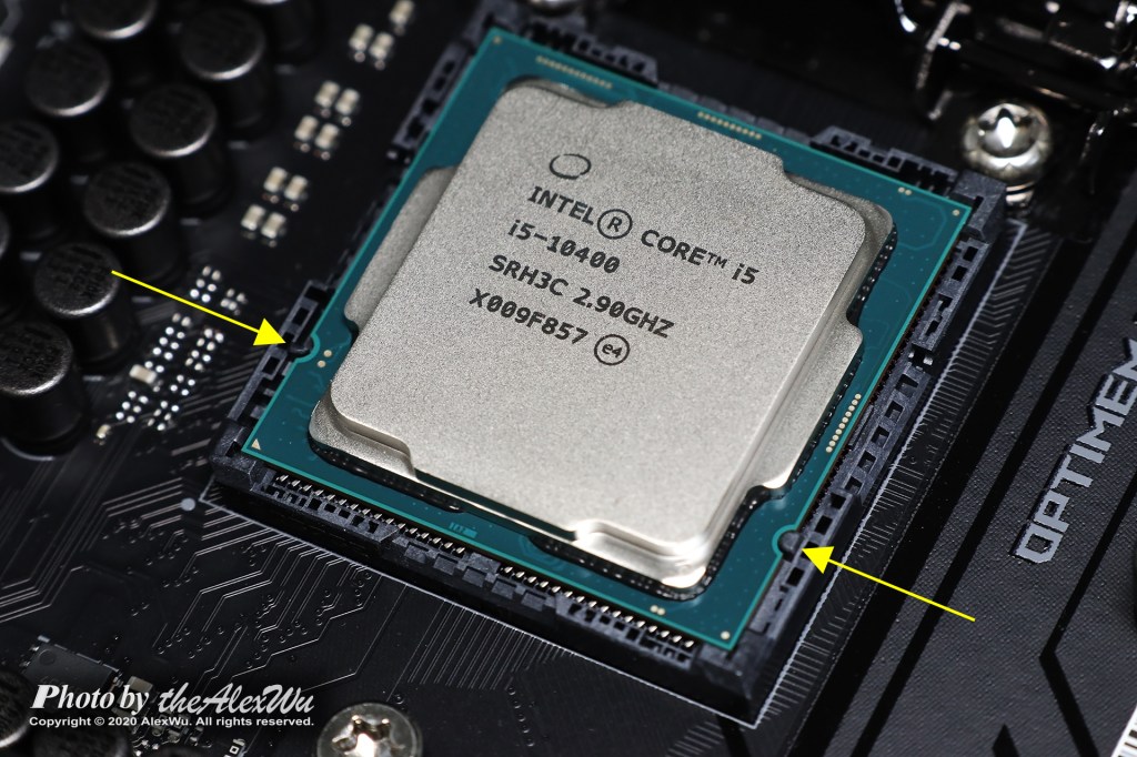 其實,相較於過去的LGA1151插槽,新的LGA1200插槽,在外觀上是有一個小地方不一樣,就是對應CPU上面兩個小凹槽的部分,位置改了!我剛開始安裝的時候沒注意,直接就給它下去了,還好還好,什麼事都沒發生,CPU插槽的針腳沒有受損,不然就虧大了!所以,大家安裝的時候千萬注意,凹槽的位置不一樣了!
