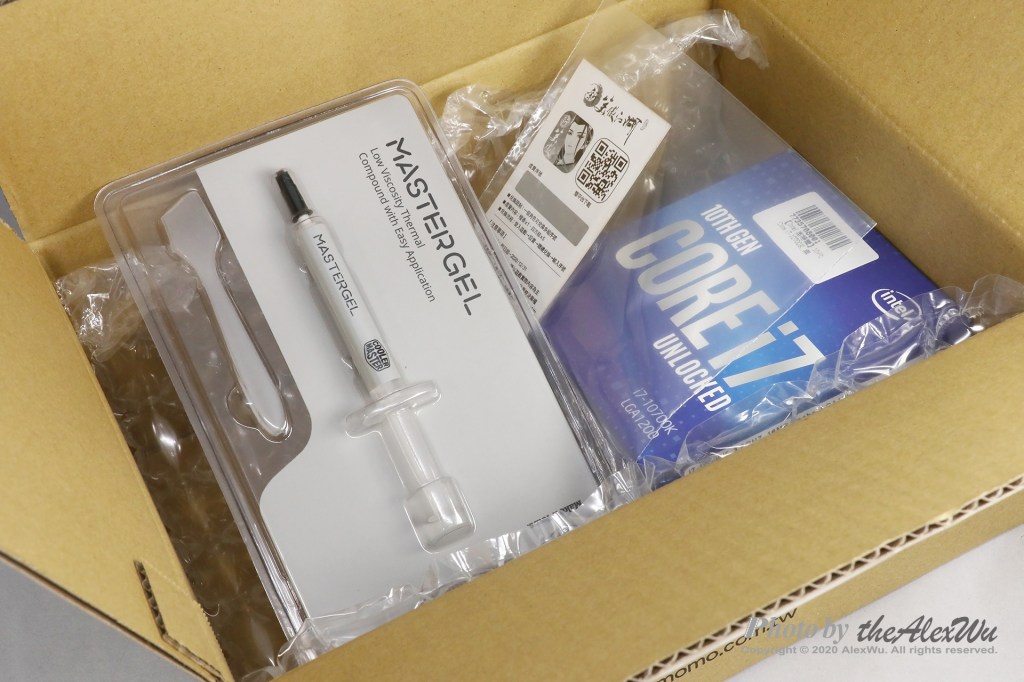 看完沒K的,接下來是有K的CPU登場:10700K。很多超頻玩家可能會對10900K比較有興趣,儘管如此,至少這顆有個K嘛,加減看一下。通路賣的時候,是一個促銷組合包,所以到貨的時候,裡面有送一支酷媽的散熱膏。 🙂