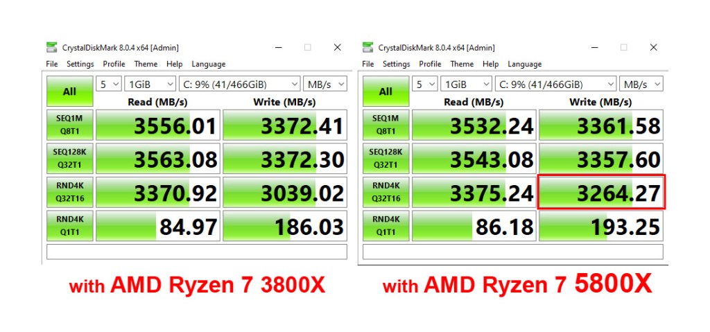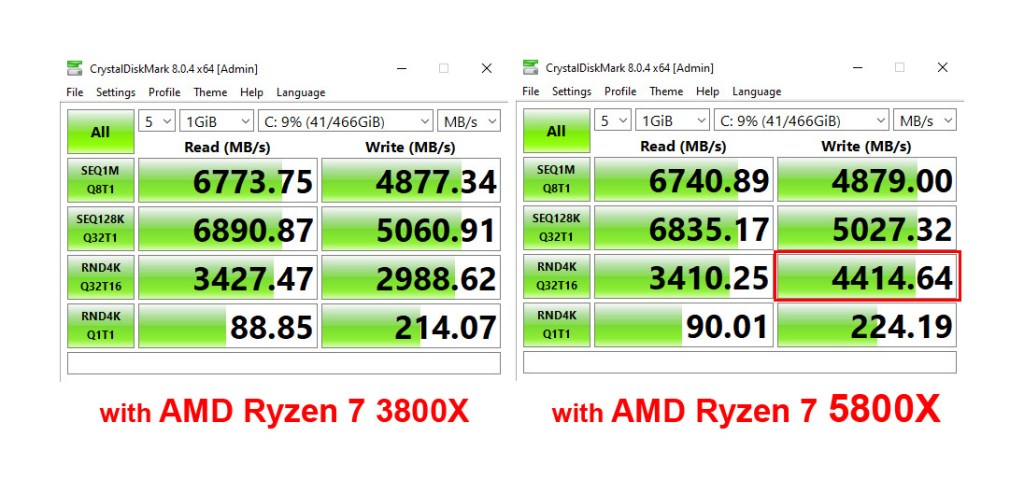 把水晶馬克的測試數據擺一起做個比較,二顆CPU跑出來的速度真的有差耶!主要是PCIe 4.0的部分,4K寫入的差異比較大(下面第一張比較圖),在PCIe 3.0的部分,其實也有小幅度的強化(下面第二張比較圖)。所以新的CPU,真的有比較厲害!