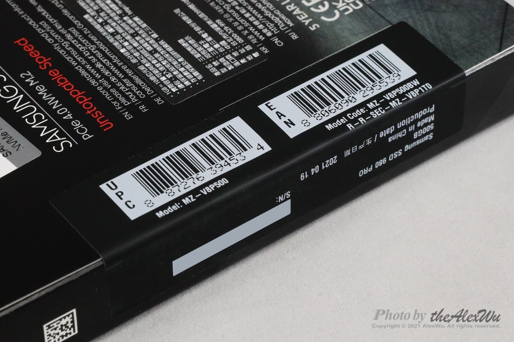 背面有一張商品標示的中文貼紙,彩盒側邊則分別用500GB的容量貼紙、以及一張產品EAN/ UPC Code的貼紙封口,割開側邊的貼紙就可以取出SSD本體了。