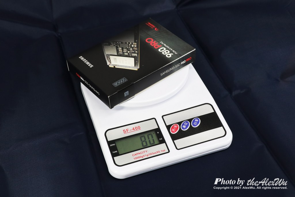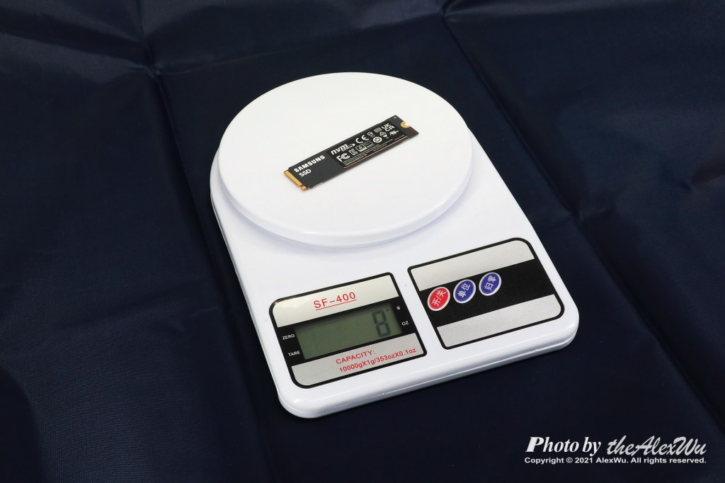 秤一下SSD本體的重量,發現只有8公克。說起來也挺有趣的,8公克的產品要動用72公克的包材去包裝它(除了讓產品包裝精美但同時也是一種保護避免運送時毀損)。