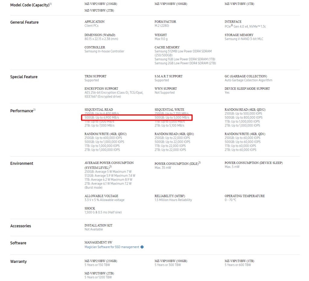 依官網上面的資料來看,我手上這個500GB的型號,循序讀取最高可以跑到每秒6900MB,循序寫入則是最高可以拉到每秒5000MB;所以彩盒上面印的那個每秒7000MB,其實指的是1TB和2TB的機種,256GB以及我手上的500GB,是沒有那麼快的。