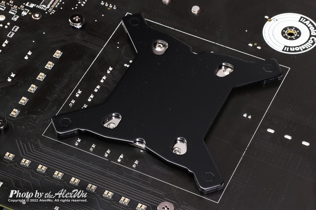 把安裝底座穿過主機板背面,看起來非常合身啊!之前林董有提醒過大家,這邊就不多說了,重點就是,主機板CPU插槽背面的那一塊金屬板,它上面那四個點,位置跟以前不一樣,不是對稱的,新設計的扣具應該沒問題,但是,如果你堅持一定要拿以前舊的扣具來用……那最好還是看一下這四個點有沒有哪裡卡到。