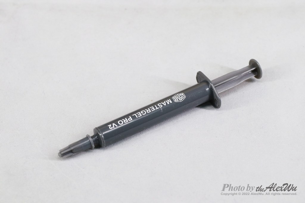 我採用的散熱膏,是我稱為大師凝膠專業二版(中文直翻)的「Cooler Master MasterGel Pro V2」,雖然之前跟拉比社長買了一罐更厲害的大師凝膠製造商(一樣是中文直翻),但是我個人認為,大師凝膠專業二版稍為「軟」一點,比較容易用刮刀抹薄、抹平,所以就用這款散熱膏來看一下,散熱器安裝好之後,是否能把散熱膏均勻推開。