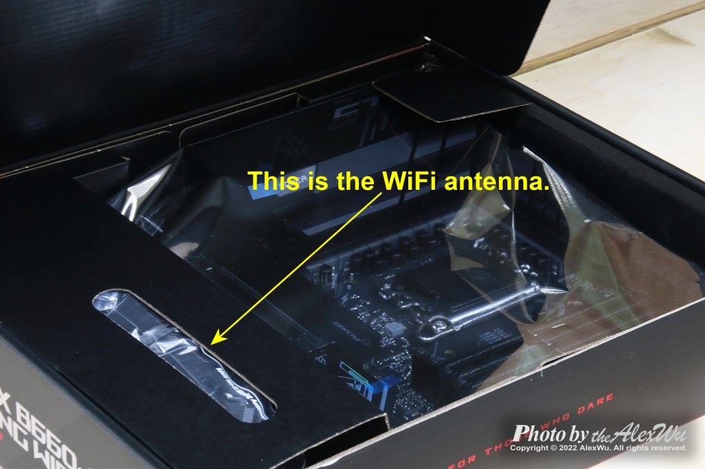打開彩盒,除了靜電袋裡面的主機板,還會看到主板上面有一個小配件,那個配件是Wi-Fi的天線。