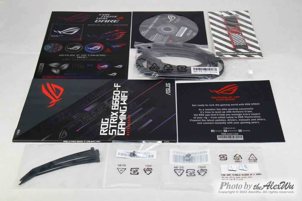 彩盒的最下面,放的是其他一些小配件,包括信仰貼紙、驅動程式CD、一本說明書、一張勸你趕快去下載安裝「Armoury Crate」的卡片(我在台灣的通路買的但是這張小卡片沒有中文)、四條SATA排線、好幾條束線帶、二個Q-Latch,另外還有二塊橡膠墊(我沒研究它們是做啥用的)、以及一個像吊飾的東西(我也沒研究這是做啥用的)。