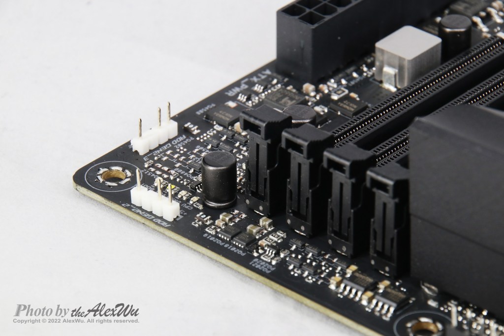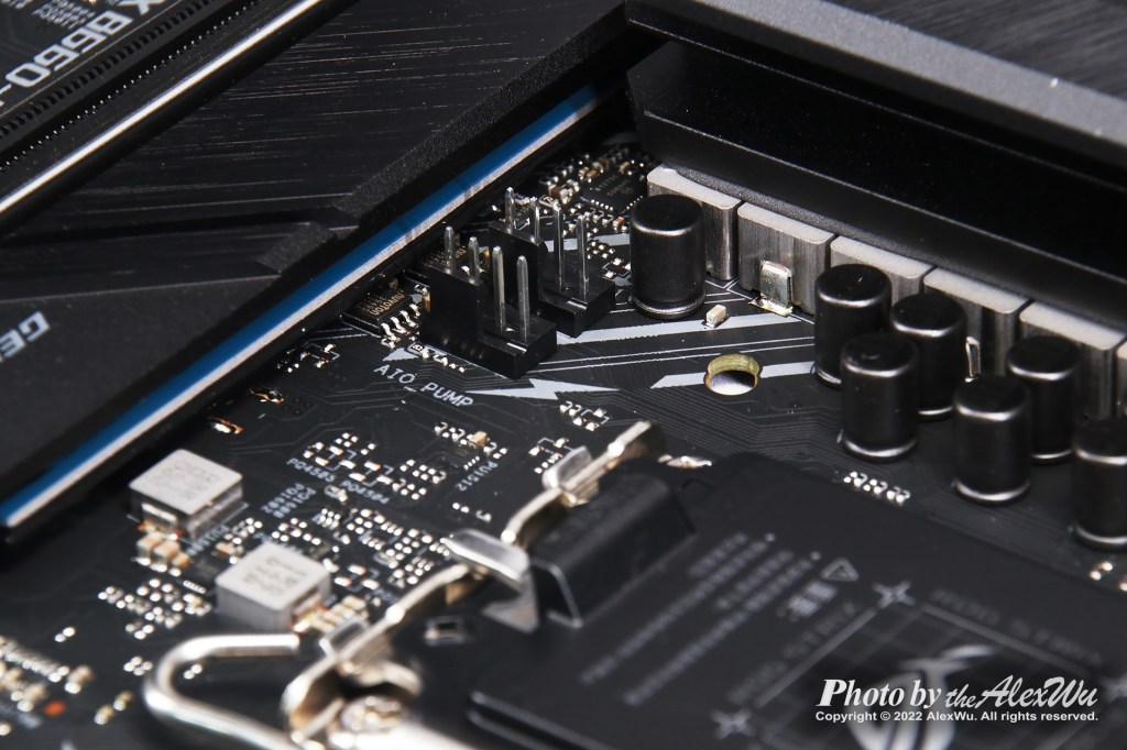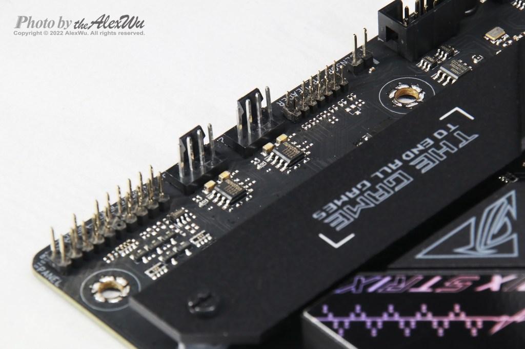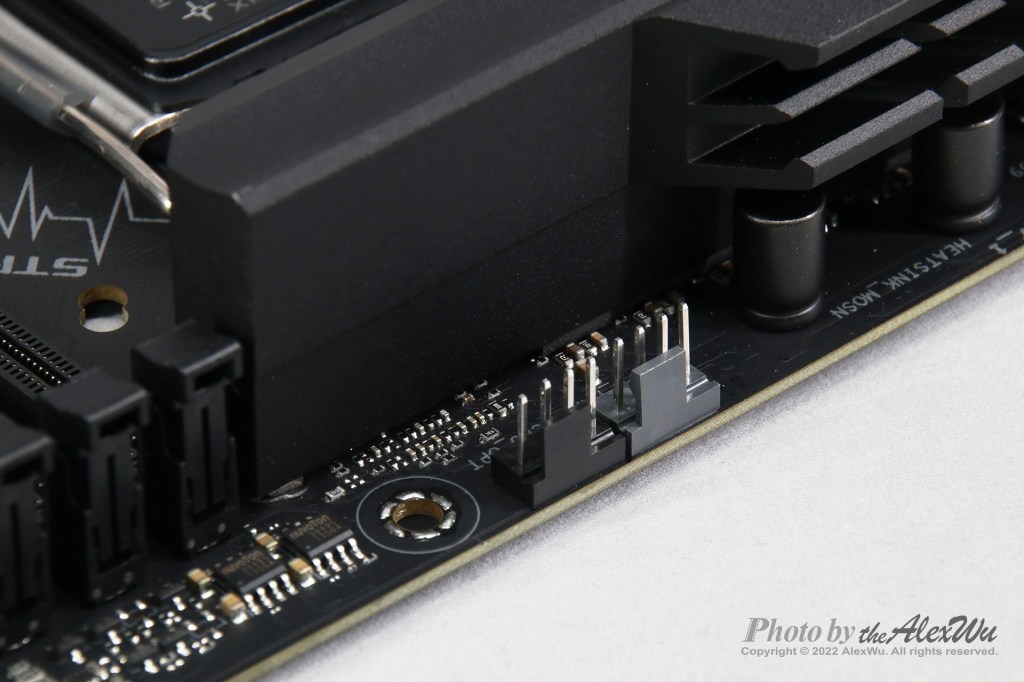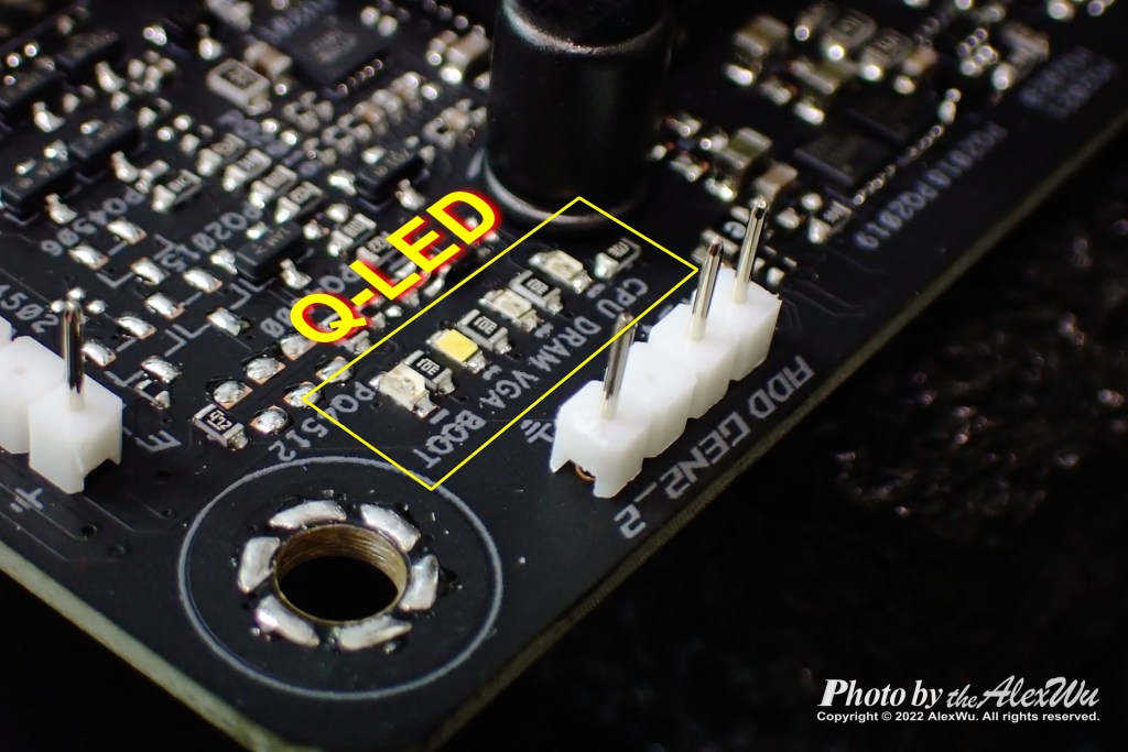 在記憶體插槽附近,有二組可定址的RGB針腳,其中一組的旁邊,有四個LED,這四個LED就是所謂的Q-LED;雖然這張Strix系列的主機板沒有Q-Code指示燈,但沒關係,至少它還有Q-LED可以參考。