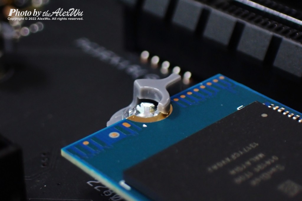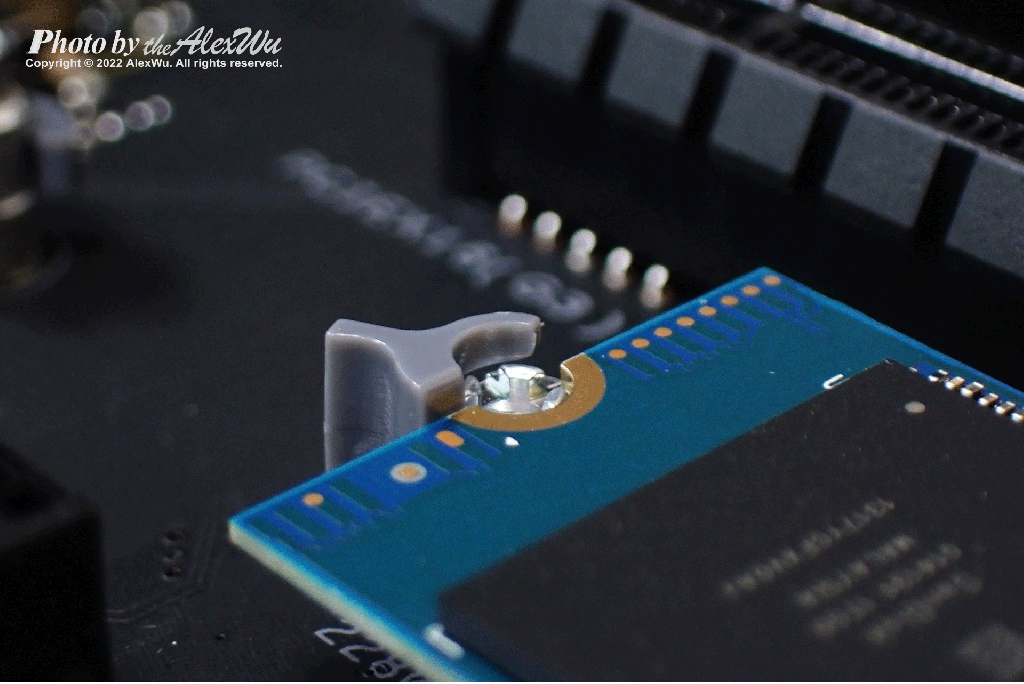 那一張勸使用者趕快下載安裝Armoury Crate的卡片,為什麼會沒有中文版,也就不管它了;重點是,那個Q-Latch挺有趣的,它是拿來鎖M.2 SSD用的,以前是用螺絲去鎖,現在有這個新設計之後,就不再需要用螺絲了。