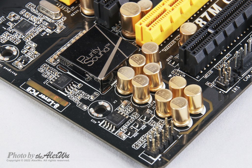 最後在音效這邊要再停一下。目前,主板上用來搭配音效晶片的電容多半會使用電解電容,雖然木耳如我,也聽不出個什麼所以然,但據說使用電解電容會讓聲音比較好聽。不過,多年前當主板廠在宣傳固態電容的時候,有一段時間,高階主機板一定是標榜全固態的!這張Z87M OC Formula,剛好是最佳的見證。