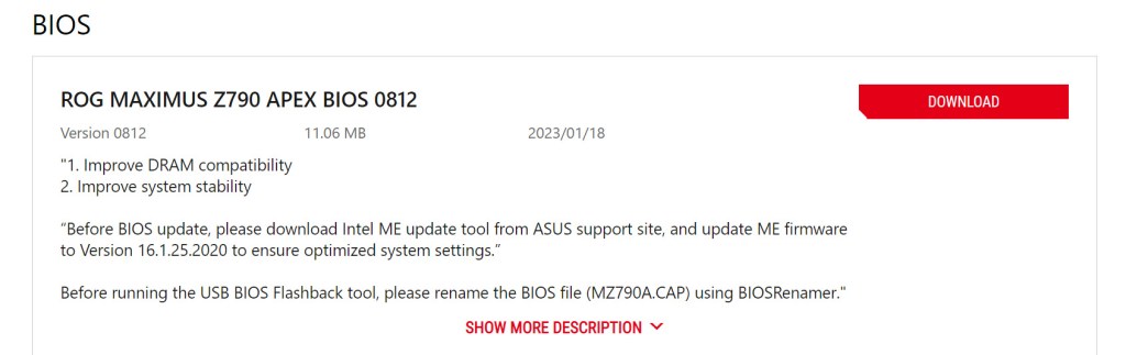 手邊有一片主機板ASUS ROG MAXIMUS Z790 APEX,是我專門拿來測試高階產品的,看了一下官網上的最新版BIOS,版本是0812,在BIOS更新說明中,第一點就先提到:提升記憶體相容性!對於還在使用0703的我而言,豈有不更新的道理,當然就衝了!