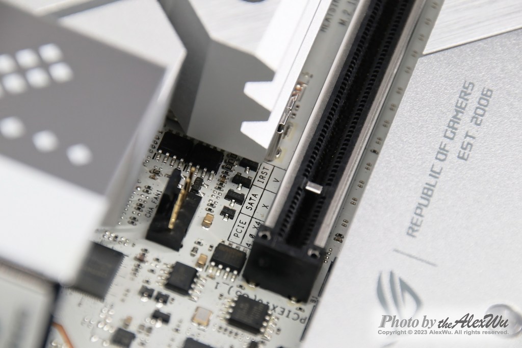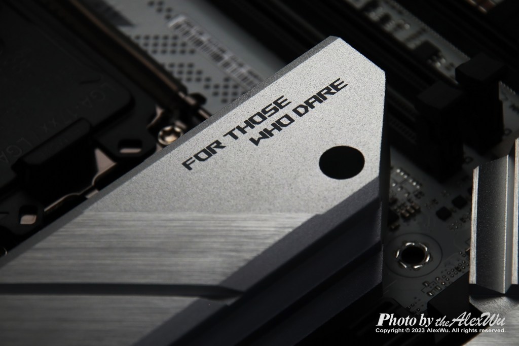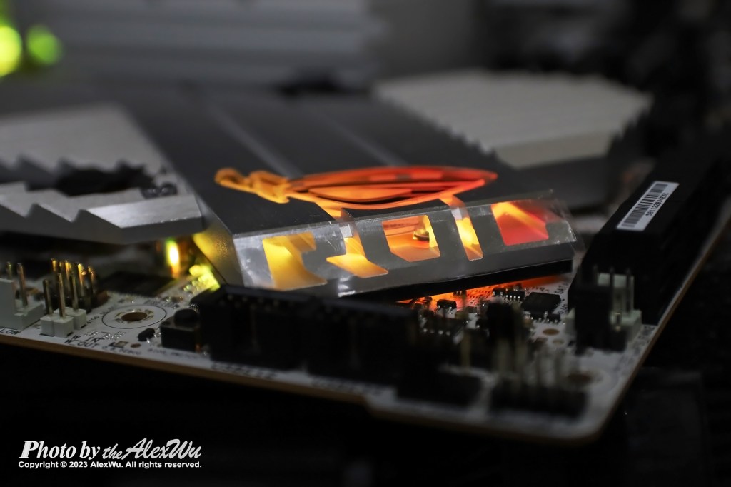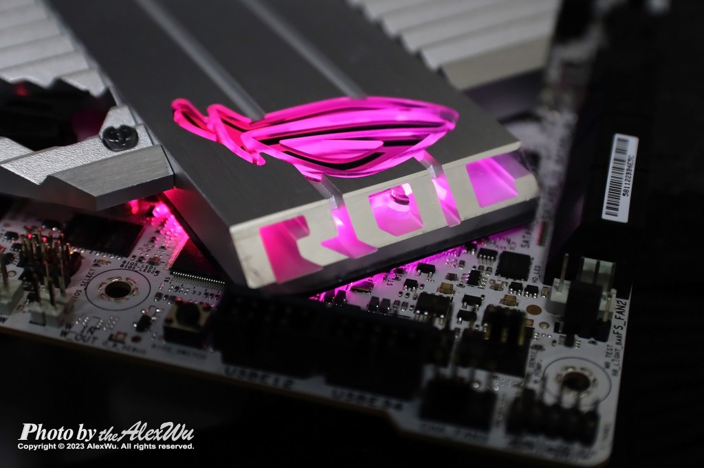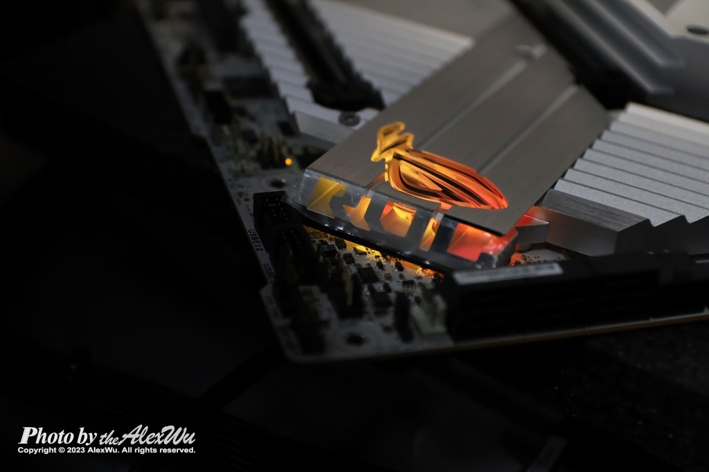 主機板搭載的大面積白銀色散熱片,在Z790晶片的上方,刻意做成了「ROG」的字樣,再搭配RGB光效,視覺上很有特色。
