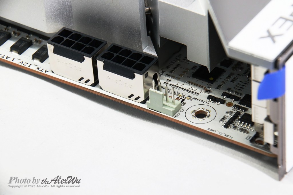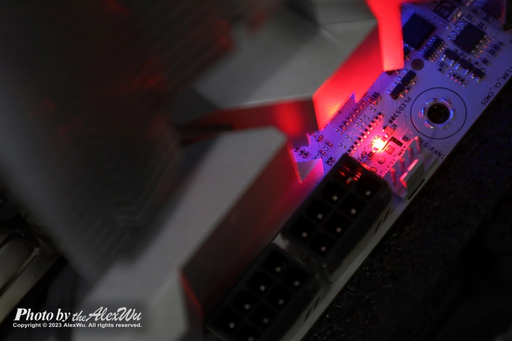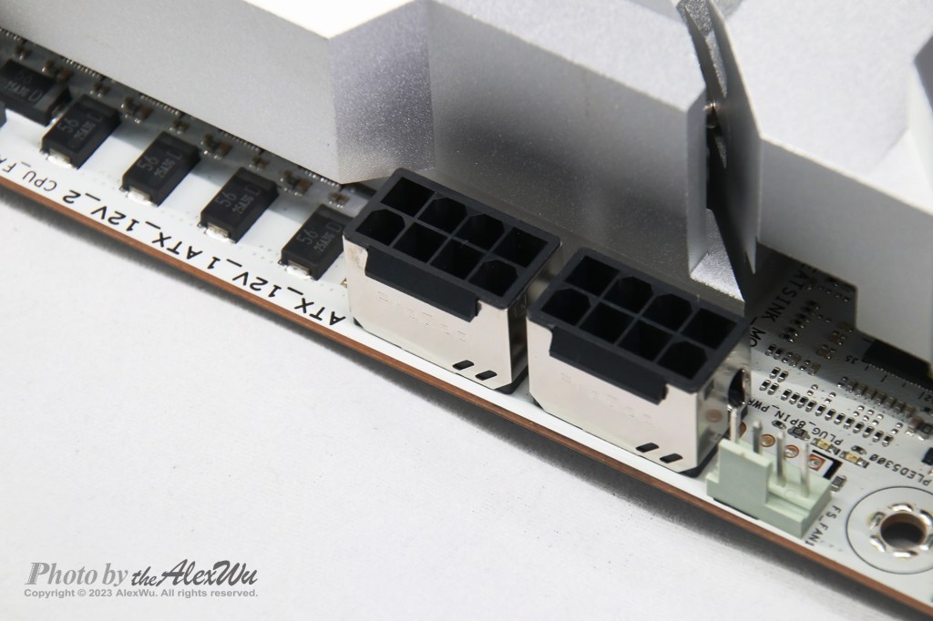CPU的12V供電插槽,採用8+8的設計,並加上了金屬護套強化;另外,為了避免使用者安裝時,這個CPU的12V供電插槽「忘了」接電,旁邊還特別加上紅色的LED提醒(沒接電時會亮燈),是極為貼心的設計。