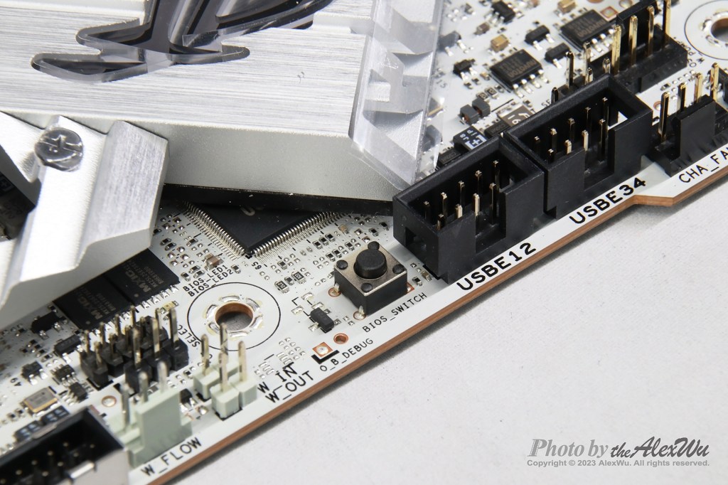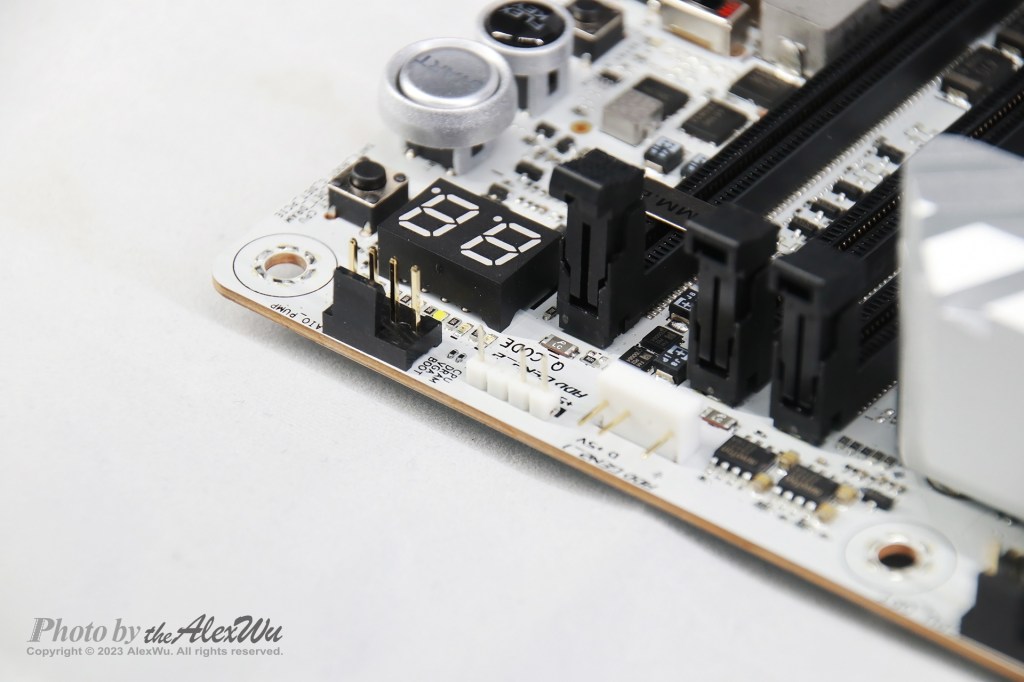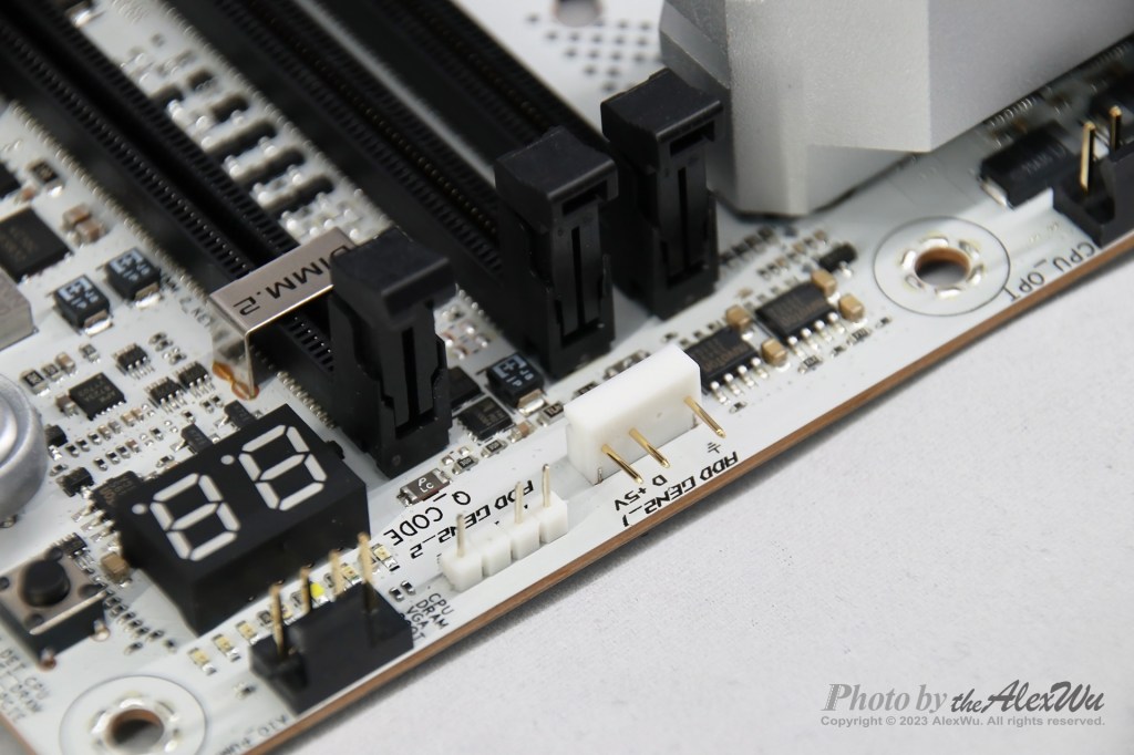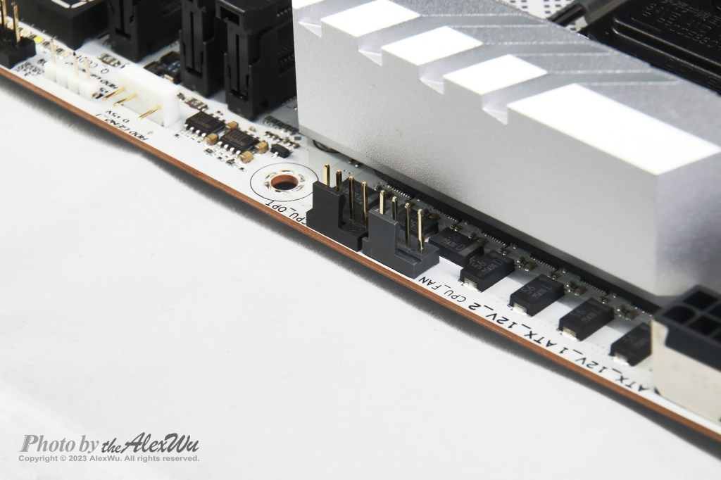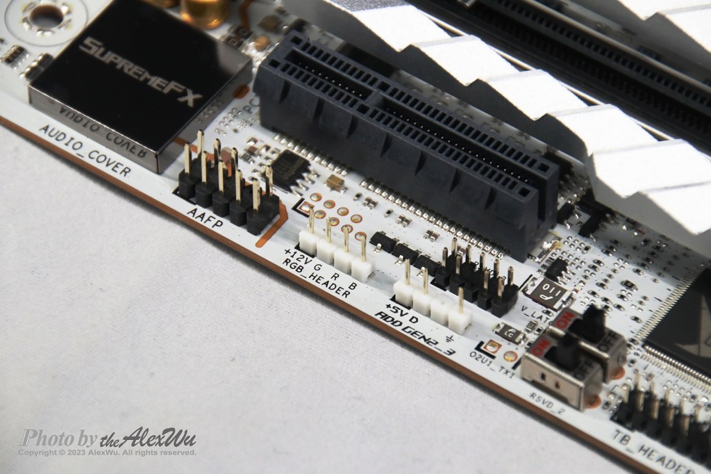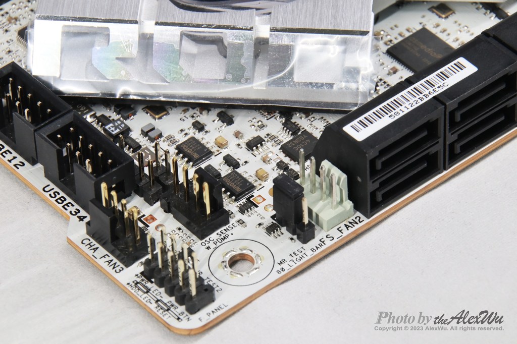 這邊要特別跟大家分享的是,記憶體插槽旁邊的那個ARGB接頭,開發團隊特別把它傾倒90度,是非常、非常、非常好的設計,身為一個記憶體瘋狂測試員,我的右手姆指,在插拔記憶體的時候,已經被記憶體插槽旁的RGB針腳、或者風扇接頭的針腳刺破了N次,刺到時真的是超、級、痛,所以這個傾倒90度的ARGB針腳,對我個人而言,實在是極為友善的設計。