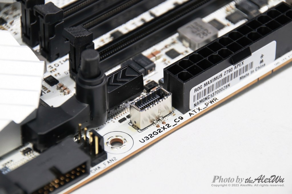 在24 pin供電插槽的左邊,有一個前面板USB 3.2 Gen 2×2 Type-C擴充插槽,是的沒看錯,這個是USB 3.2 Gen 2×2,所以資料傳輸率最高可以到20Gb/s。