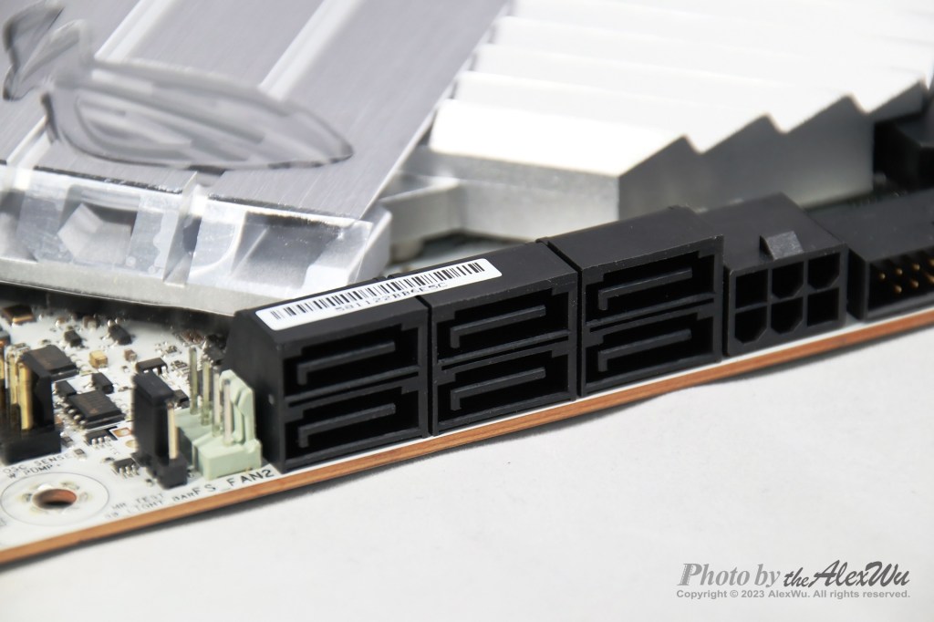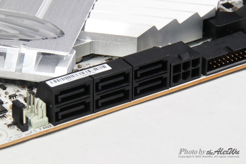 如果你還有在用SATA硬碟或SATA介面的SSD,這張主板一樣有六個SATA插槽可以用,畫面靠右邊的那四個,可以支援0/1/5/10四種模式的磁碟陣列。
