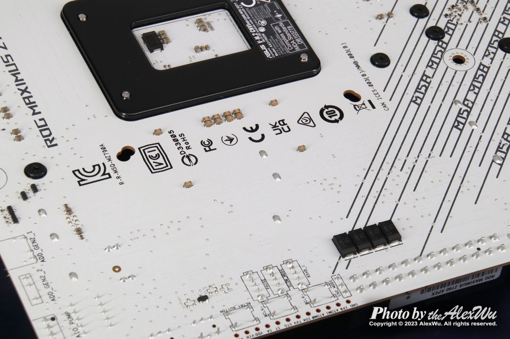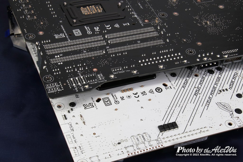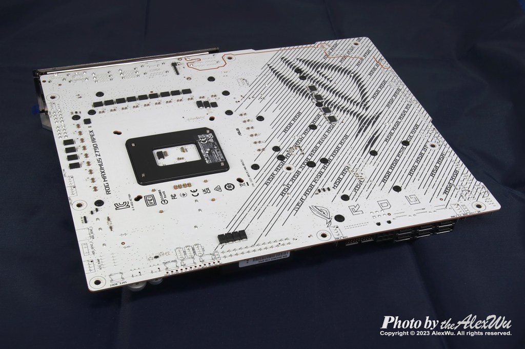 翻過來瞧瞧主機板背面,有大面積的ROG Logo印刷,但沒有任何金屬擋板。不過,還是有值得聊一下的重點。