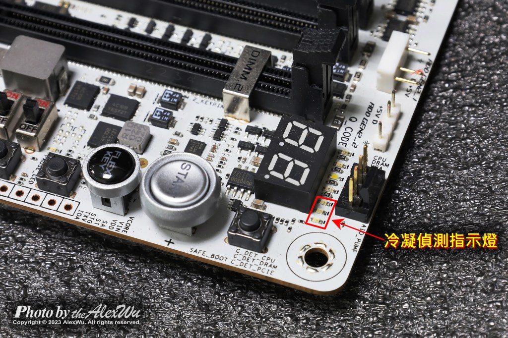 重點,對極限超頻玩家而言,防水算是基礎建設,一定是防水措施先處理好,然後才會上液態氮。話雖如此,但在實務操作上,難免有時候會因為水氣入侵導致超頻失敗,而為了避免這種狀況發生,這張主機板甚至把「冷凝偵測指示燈」也做上去了,以便提示使用者,CPU、記憶體或顯卡插槽可能有水氣凝結導致短路。說起來,這張主機板真的很「超頻」啊!
