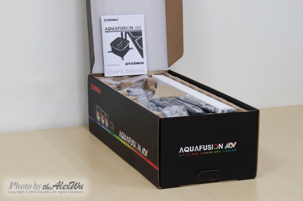 彩盒裡面除了散熱器本體(水冷頭+冷排),另外就是風扇、安裝配件、以及說明書。