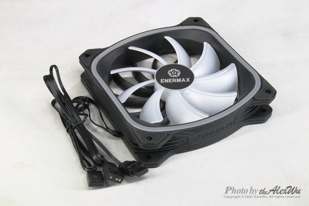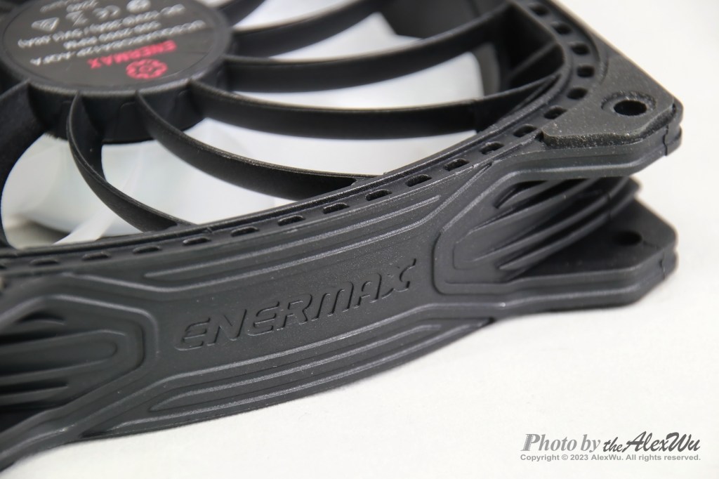 外觀的部分,九個半透明的扇葉一看便知,是帶有RGB光效的(實際上是ARGB),風扇側邊有安耐美的Logo,四個角落有加上橡膠墊防震。