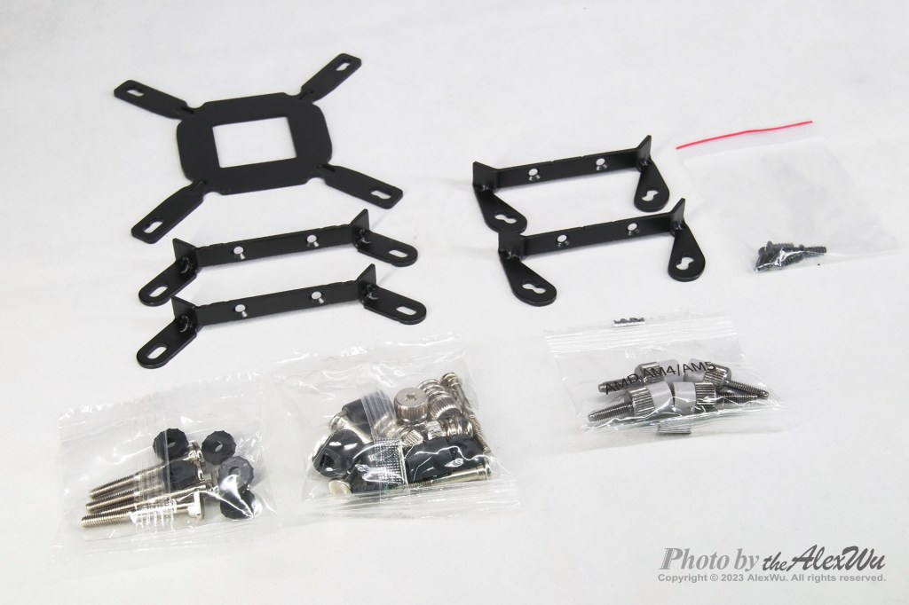 彩盒裡主要就是兩大包,再加上一本使用手冊。把二大包安裝配件拿出來分類「擺盤」,Intel和AMD最新的LGA1700、AM5都能支援。
