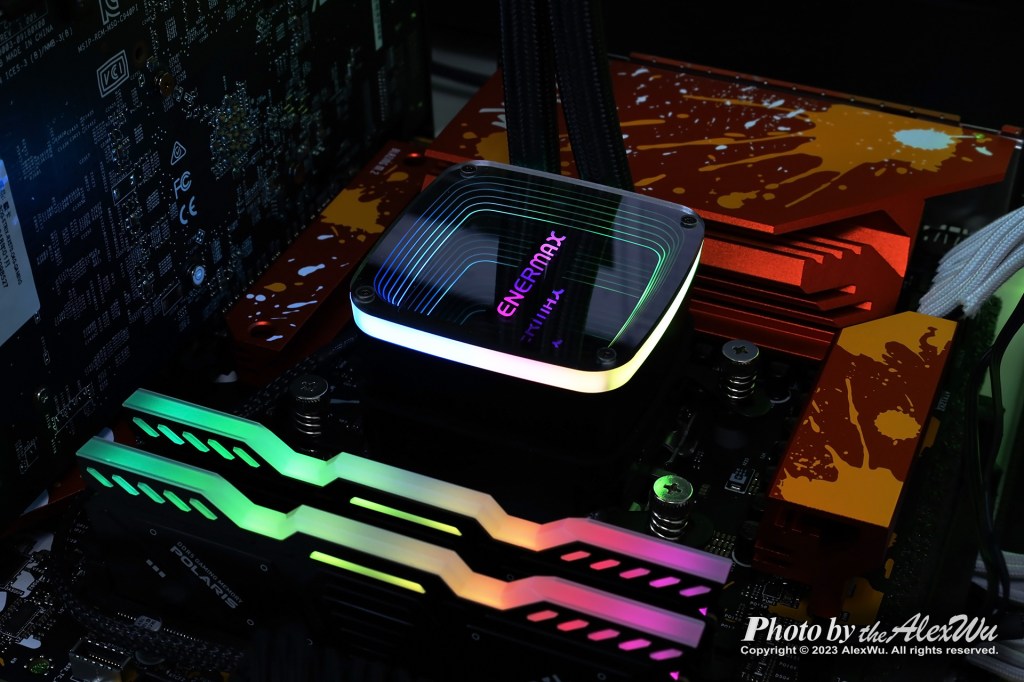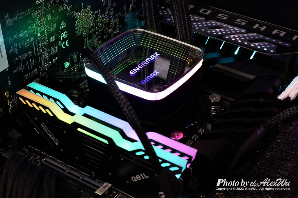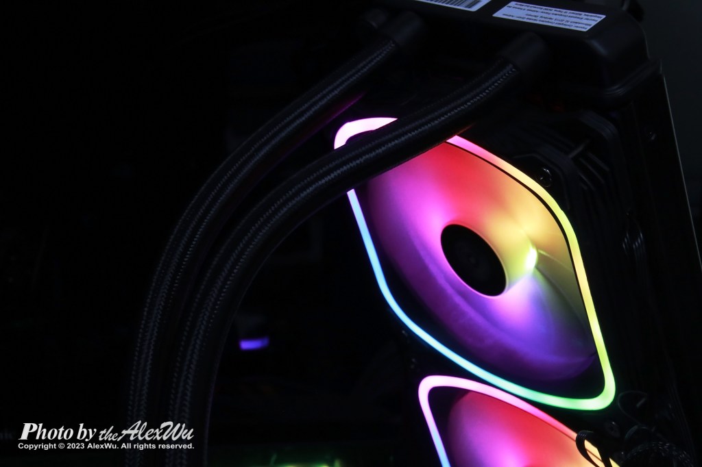 風扇的光效出乎意料的好看,只有外面一圈RGB、或只有裡面扇葉的RGB,都沒有兩個加在一起厲害,照片能呈現的效果有限,眼睛實際上看到的感受很強烈,真的是……非常……非常「幻彩」啊!