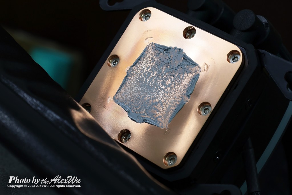 實際安裝在Intel的LGA1700平台、以及AMD的AM5平台,散熱膏擠開的效果還不錯,顯示水冷頭與CPU表面的接觸狀況良好。