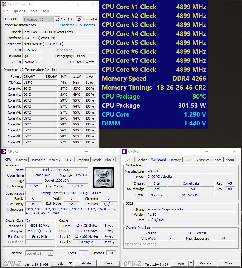 在2020年的年底,洽巧當時有機會測試過某品牌的AIO 360一體式水冷散熱器,當時的測試平台,主機板是華擎的Z490 PG Velocita(之前PO過分享文,文章在這兒:https://wp.me/p9vw8v-7m),CPU則是Intel Core i9-10900K,測試軟體是跑Prime95,燒機20分鐘後90度、各核心最高的溫度是到95度,這個測試結果,和這一集的「特仕版360」差不多,不同的是,當時的燒機功耗是300W。