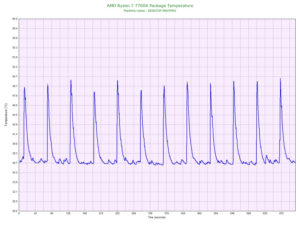 在絕大部分的時間裡,溫度幾乎都維持在37度左右,AIDA64的統計資料顯示,平均溫度為38.5度,應該是因為待機時有週期性的溫度高點,把平均值拉高了。