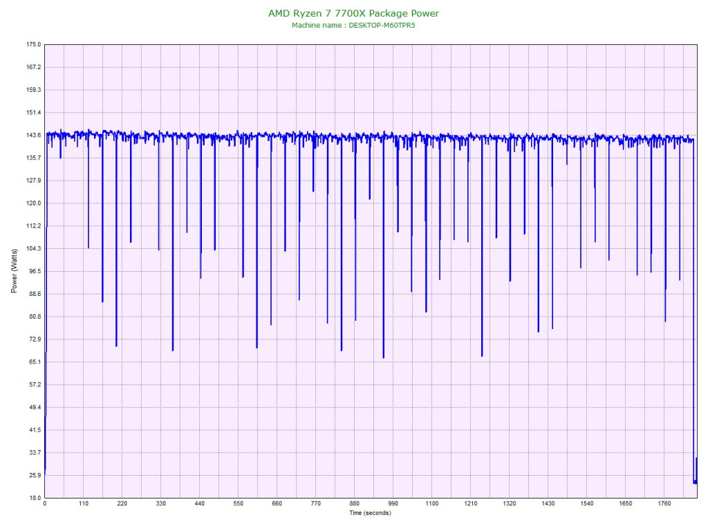 仔細觀察HWMonitor Pro 1.52的統計圖表,雖然幅度極小,但燒機功耗是有逐漸下滑的現象;對照AIDA64的統計資料,平均功耗是141.43W。