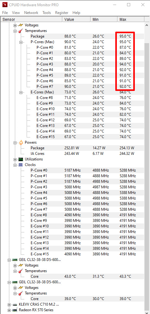 雖然AIDA64依然說它偵測到CPU過熱了,但CPU Throttling的百分比一直都是0%;其次,HWMonitor Pro 1.52的即時監測畫面裡,溫度較高的P-core最高是95度,沒有頂到100度。所以,二級功耗(253W)的發熱量,「特仕版360」壓得住沒問題。