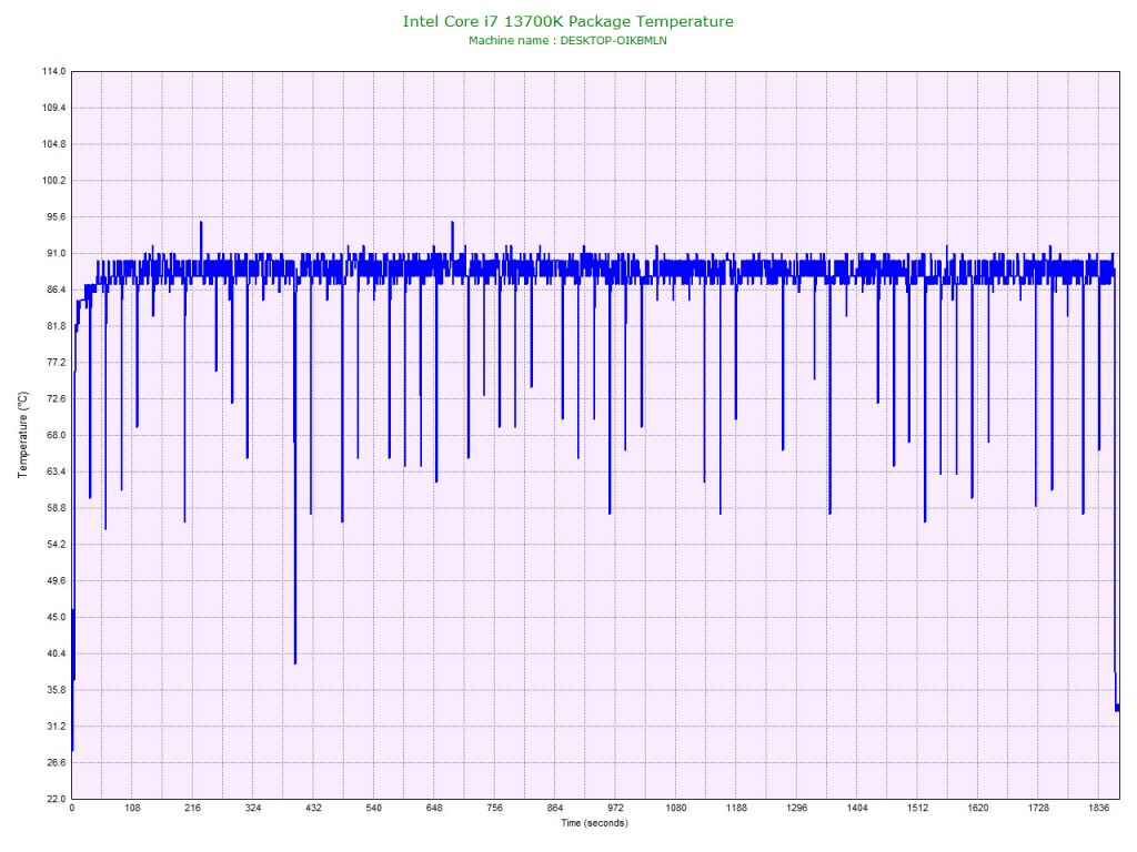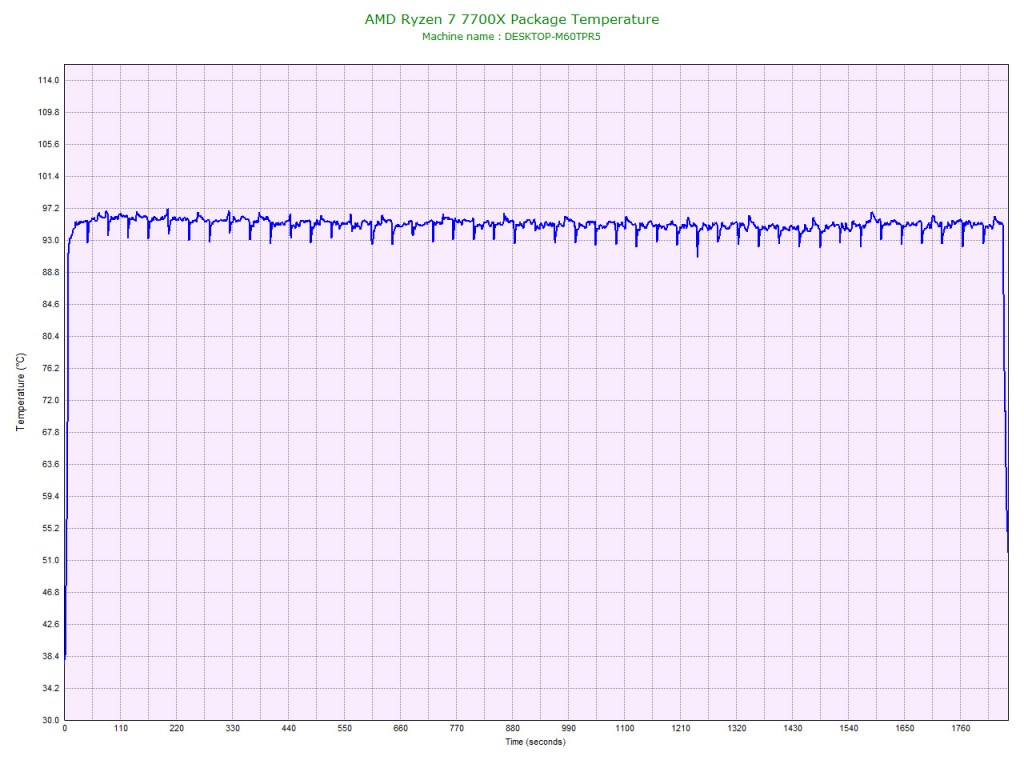 接著開啟Cinebench R23.2循環燒機,30分鐘後溫度為94度,AIDA64的統計資料顯示,平均溫度為93.3度。溫度變化狀況可以參考HWMonitor Pro 1.52的統計圖表。