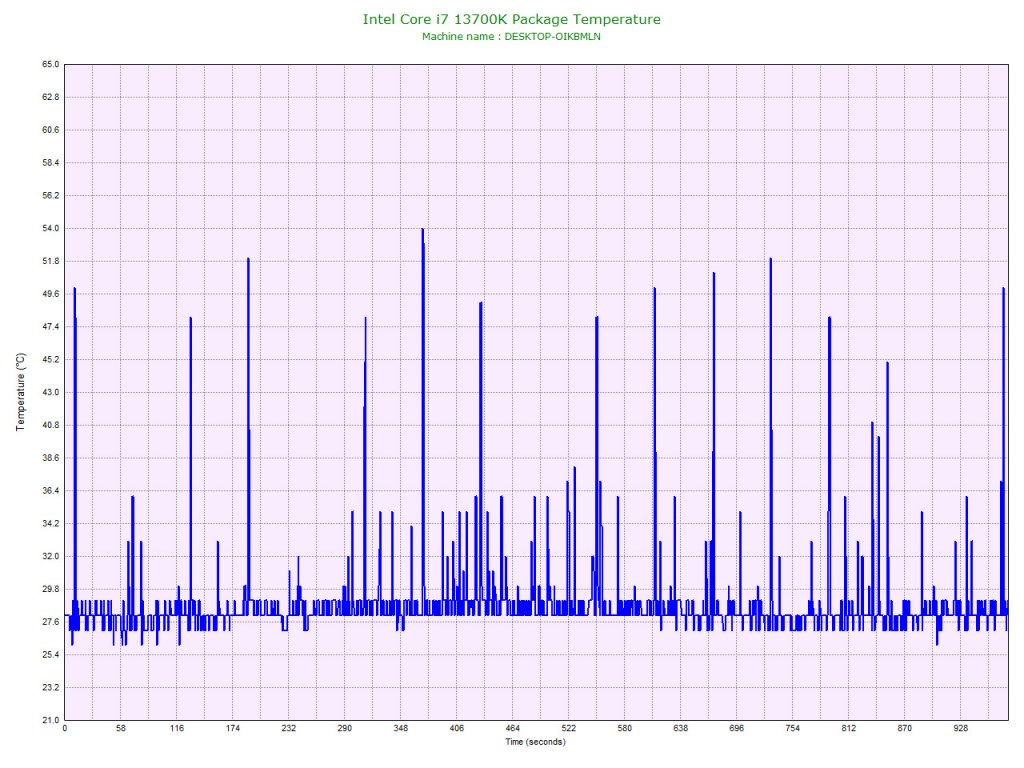 在絕大部分的時間裡,溫度維持在28度上下飄移,AIDA64的統計資料顯示,平均溫度是28.4度,溫度變化狀況可以參考HWMonitor Pro 1.52的統計圖表。