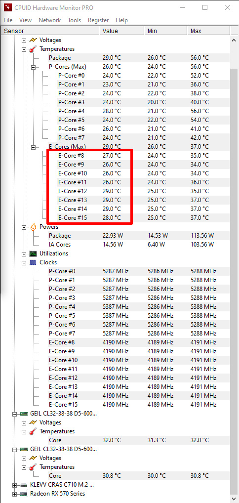 然後,待機狀態下也一樣有觀測到,P-Core的溫度比較低、E-Core的溫度比較高,顯然在「待機」這種沒什麼重大負荷的情況下,主要的背景運作,應該是以小核為主。